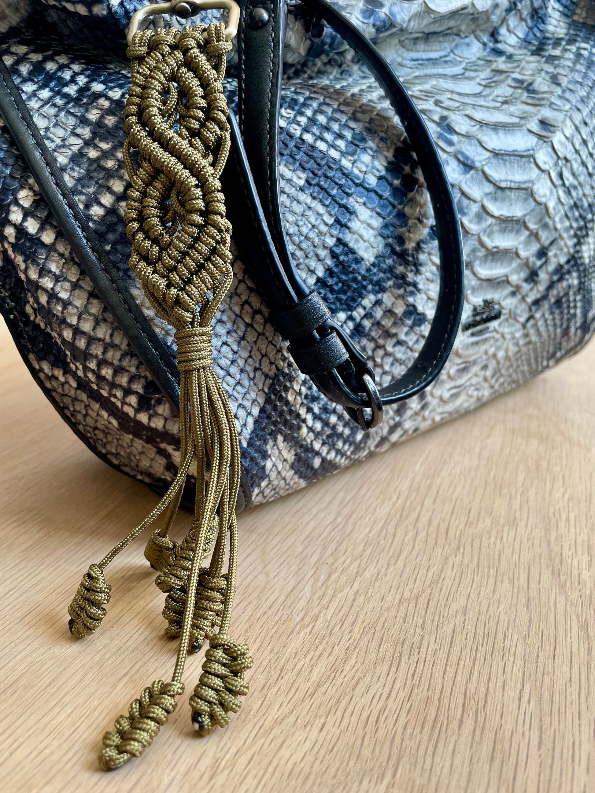 Handmade macramé keychain in Orégano Double Diamond Knot.