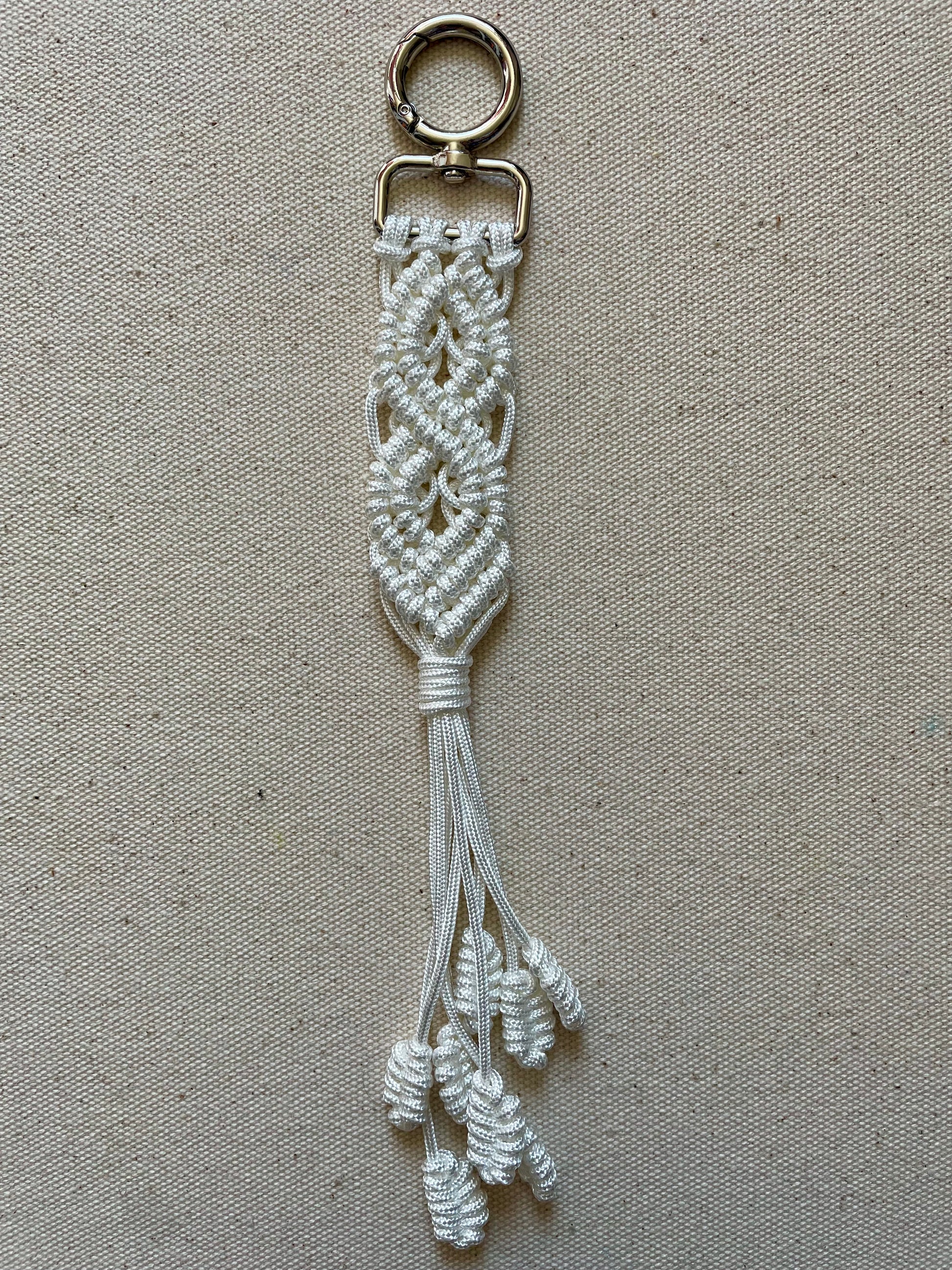 Handmade macramé keychain in Glossy White Double Diamond Knot.