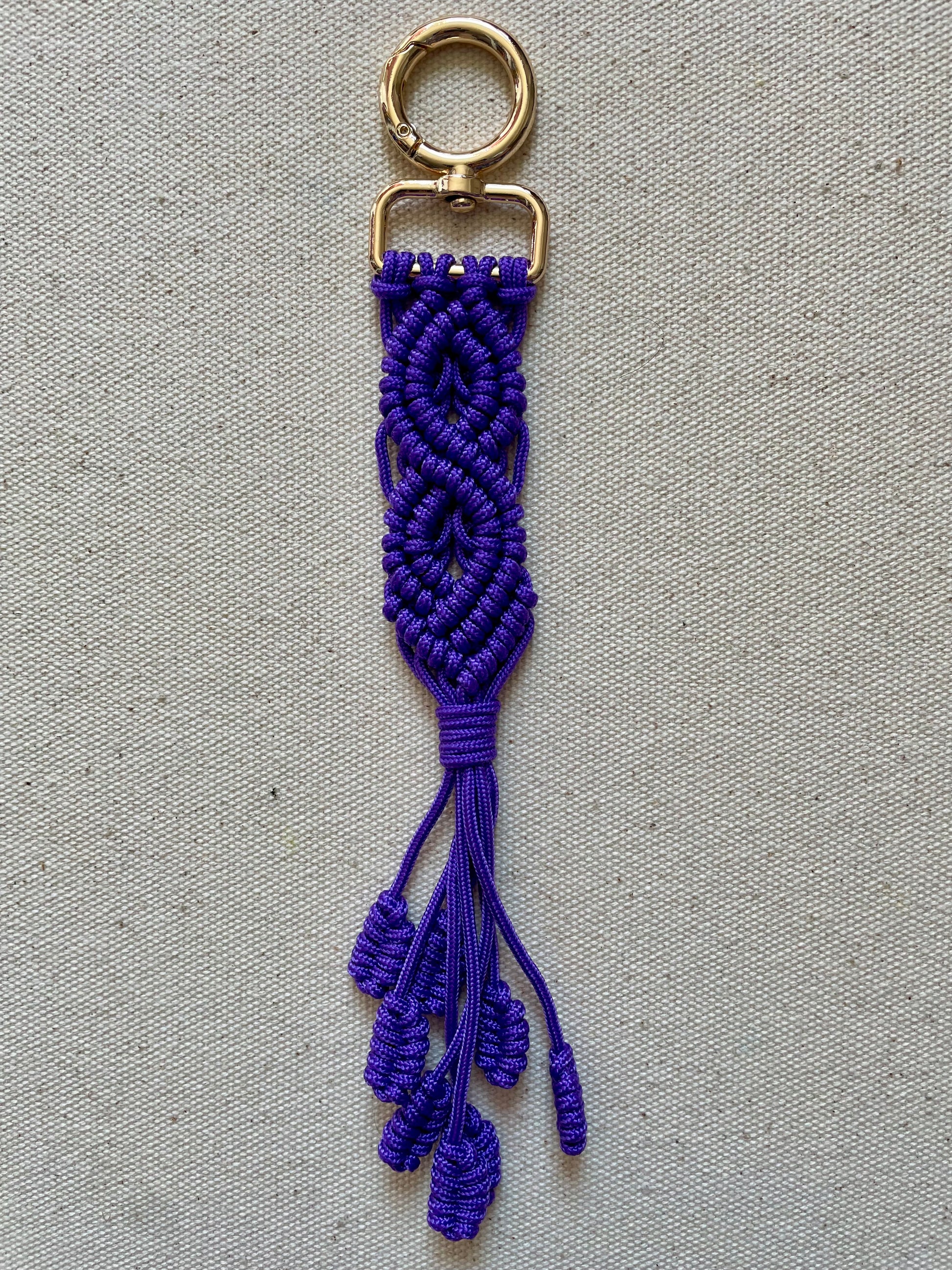 Handmade macramé keychain in Purple Double Diamond Knot.