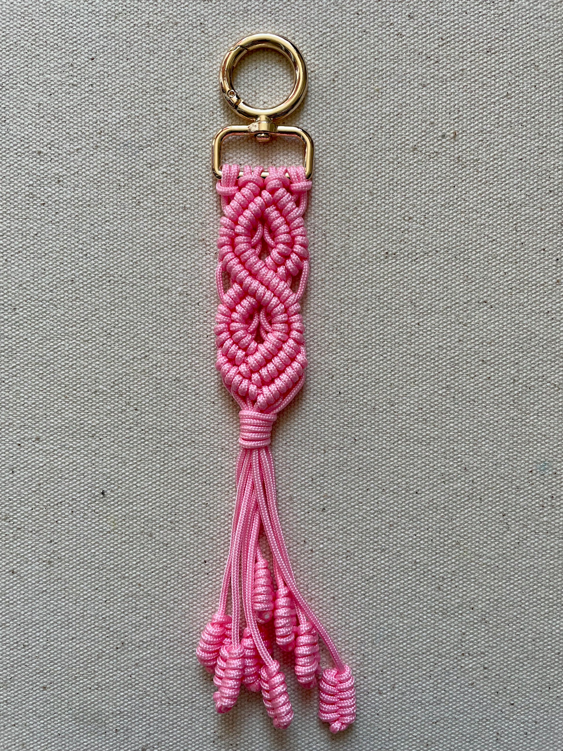 Handmade macramé keychain in Baby Pink Double Diamond Knot.